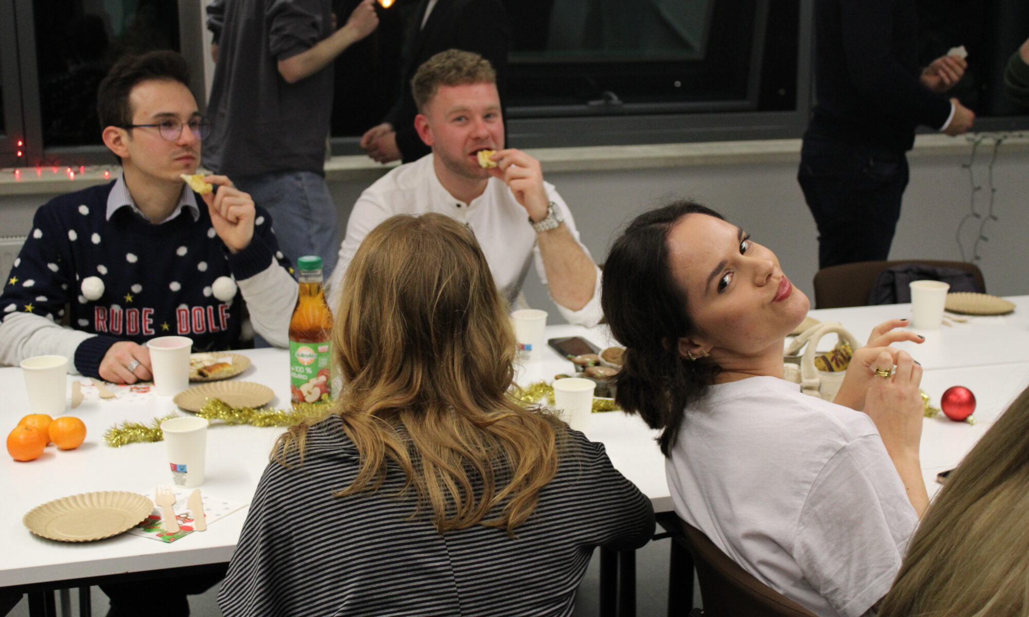 Sala prób zamieniła się w miejsce pełne ciepła, zapachu świątecznych potraw i – co dla nas najważniejsze – radosnych rozmów. Przy dźwiękach wspólnie śpiewanych kolęd, dzieliliśmy się opłatkiem i składaliśmy sobie nawzajem życzenia. Te chwile przypominają nam, że Dominanta to coś więcej niż zespół muzyczny – to wspólnota ludzi połączonych pasją, która buduje trwałe więzi.